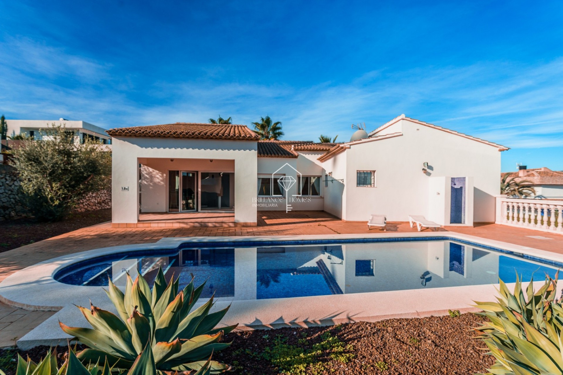 Villa im mediterranen Stil exklusiv von 200 m² zum Verkauf, in einer ruhigen Gegend von Piver, ideal für diejenigen, die Ruhe und Privatsphäre suchen, ohne die lokalen Dienstleistungen und den Strand und das Freizeitgebiet zu verlassen. Für diejenigen, die ein Zuhause suchen, das sich auf einer Etage befindet, ist diese Immobilie perfekt: Es gibt einen Flur, der zu einem geräumigen Wohn-Esszimmer führt, ideal für Familienfeiern. Die voll ausgestattete Küche bietet alles, was Sie für das tägliche Leben benötigen. Es verfügt über drei Schlafzimmer, alle mit Einbauschränken und elektrischen Jalousien, zwei gut verteilte Badezimmer (eines davon en suite) und eine zusätzliche Toilette. Es verfügt auch über eine Naya mit Zugang vom Wohnzimmer aus, so dass Sie das Wetter zu jeder Jahreszeit genießen können. Das Äußere des Anwesens zeichnet sich durch einen einfachen Garten aus, in dem Sie den ganzen Tag über die Sonne genießen können, die den privaten beheizten Pool umgibt, ideal zum Abkühlen und Genießen sonniger Tage mit Blick auf den Montgó. Mit Parkplätzen für mehrere Fahrzeuge, müssen Sie es besuchen, um die Qualität der Konstruktion und der Annehmlichkeiten zu schätzen.