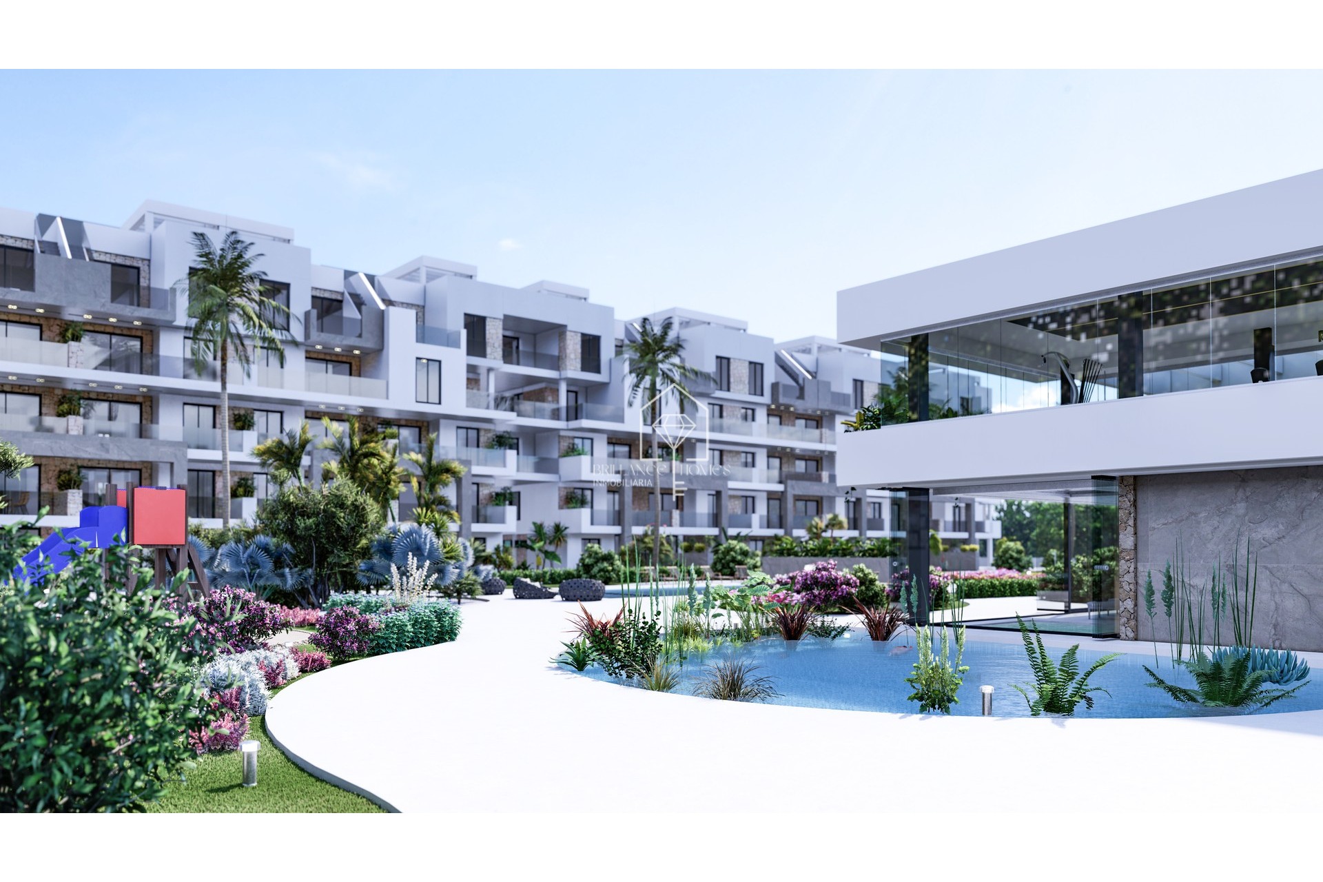 Located in the picturesque area of El Raso in Guardamar del Segura, this exclusive private residential complex offers 135 beautifully designed homes, available in configurations of either two or three bedrooms. Each dwelling showcases a minimalist style and adheres to the highest quality standards. The modern architecture seamlessly integrates large open spaces with nature, creating a serene and unique environment complete with majestic pools. This project is set in an exceptional location, with captivating views of the natural landscape surrounding the salt lagoon—a habitat rich in biodiversity. It is also positioned conveniently near some of the Mediterranean's most breathtaking beaches. The proximity to El Moncayo beach provides opportunities for cycling excursions and enjoying the delightful climate of Costa Blanca. Residents have access to a glass-walled gym and spa area with stunning views of the lush green spaces and pools, in addition to an elegant terrace offering panoramic vistas of the La Mata salt lagoon. The complex also features a padel court among other amenities. The luxurious penthouses present an exclusive living experience with solariums equipped with kitchens, outdoor showers with both hot and cold water, and jacuzzis, all set against a remarkable backdrop. Living in Guardamar del Segura offers the perfect blend of coastal beauty and comfort. With real estate options ranging from 263,000 € to 370,000 €, and spacious homes between 77 m² and 97 m², Complex represents an ideal choice for those seeking a tranquil yet vibrant lifestyle amidst nature's finest offerings.