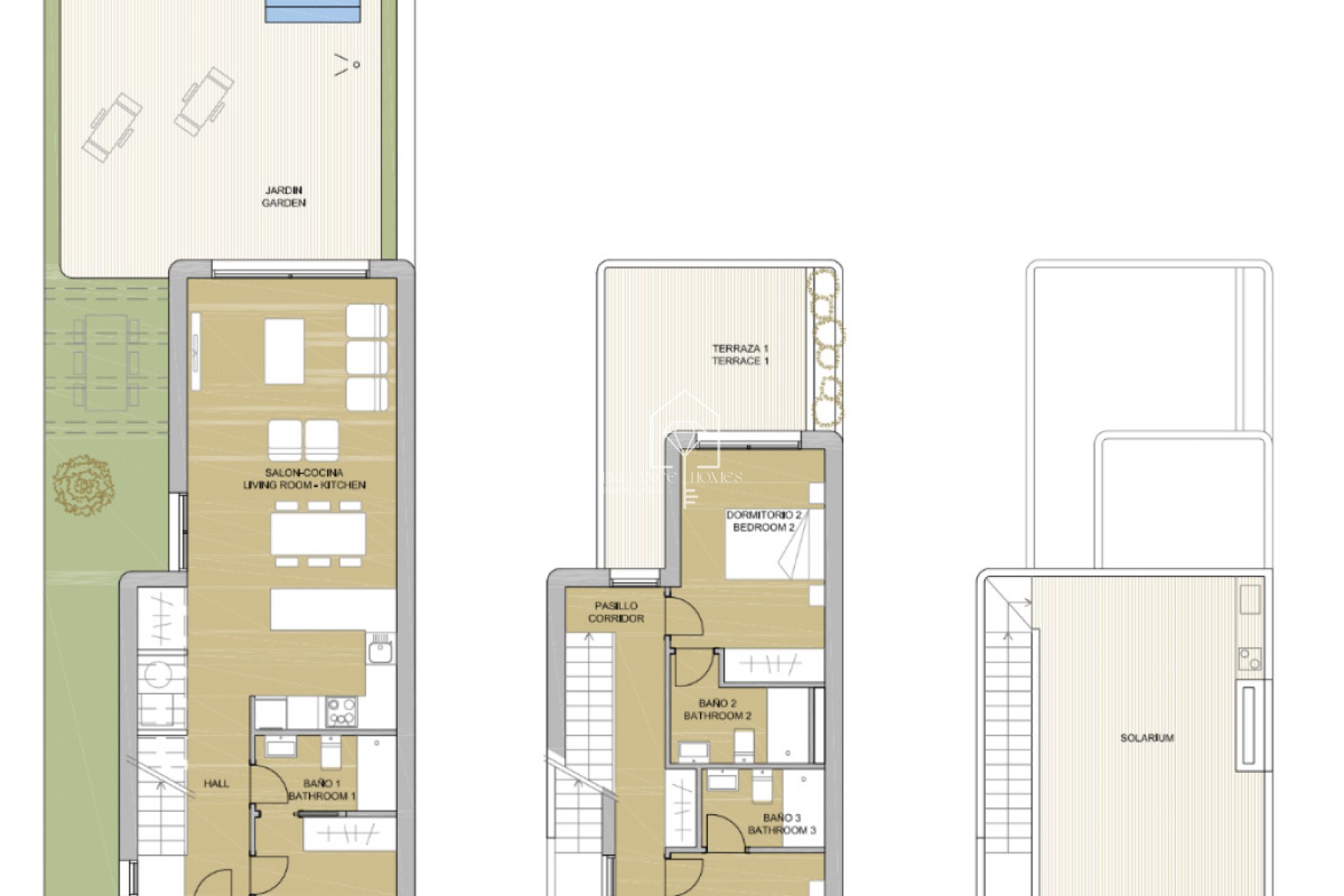 This residential project has been meticulously crafted to fully embrace the Mediterranean climate. Each villa boasts stunning terraces, a rooftop solarium, and a beautifully designed garden complete with a swimming pool. Enjoying an excellent orientation, the project is conveniently located near the beach and set within a well-established community offering sports facilities and leisure areas. The villas are spread over two stories with spacious and functional layouts. The ground floor, seamlessly connected to the garden, includes a bright living-dining area with an integrated kitchen, a master bedroom, and a bathroom. The upper floor houses two double bedrooms, each equipped with its own bathroom, and is crowned by an impressive rooftop solarium. This residential area is strategically situated in a prime location within the region. Offering tranquility and close proximity to the beach, along with access to a wide array of services, it stands out as an ideal place to live, whether you are seeking relaxation or an active lifestyle. Living in this vibrant city means enjoying the best of both worlds—tranquil residential areas and immediate access to the bustling heart of the city. With a price range set at 539,900 €, these luxurious homes feature three bedrooms and cover a surface area of 131 m², making them a perfect choice for those seeking both comfort and elegance.