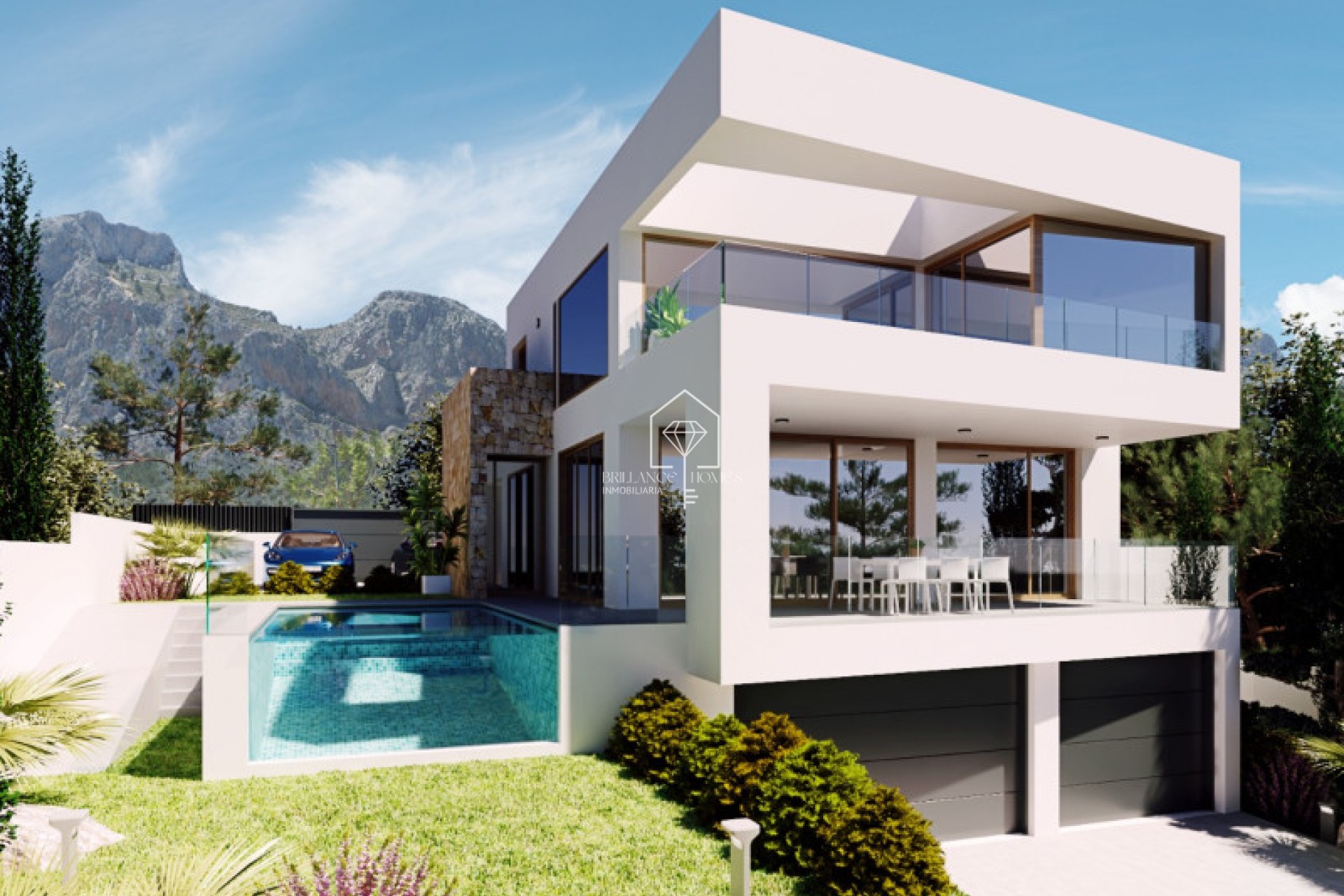 In het betoverende gebied van Polop, gesitueerd in Alicante, biedt zich een unieke kans aan om luxe villa's met een hedendaags design te verwerven. Deze exclusieve villa's bieden adembenemende uitzichten op de indrukwekkende monte en omringende bergen, alsmede de horizon van de Middellandse Zee. Deze bijzondere promotie bevat moderne villa's, elk gelegen op een eigen perceel. De villa's bieden innovatieve architectuur en een uitzonderlijke combinatie van creativiteit en kwaliteit in elk detail. Met een oppervlakte van 294 m², verdeeld over drie verdiepingen, beschikt elke woning over drie slaapkamers en drie badkamers, waarvan vooral de façade van natuursteen in het oog springt. Bij binnenkomst worden de bewoners verwelkomd door een ruime hal die leidt naar een Amerikaanse keuken en een lichte woon-eetkamer. Het interieurontwerp omvat vloerenhoge ramen, plafonds van 3 meter hoog, en schuifdeuren die opengaan naar het terras, ideaal voor familiebijeenkomsten. Buiten zijn de overdekte terrassen ontworpen om te genieten van het mediterrane klimaat, met zit-, eet- en ontspanningsruimtes naast het privézwembad. Op de eerste verdieping bevinden zich twee dubbele slaapkamers, waaronder een hoofdslaapkamer met en-suite badkamer, inloopkast en toegang tot een privéterras. Hier ontvouwt zich een panoramisch uitzicht over het landschap. De volledig uitgeruste kelder van 100 m² biedt een veelzijdige ruimte die kan worden omgetoverd tot een zelfstandig appartement, compleet met een eigen entree en een garage met een elektrische poort. De villa's zijn uitgerust met de nieuwste technologieën en comfort: dubbele beglazing, elektrische rolluiken, LED-verlichting, aerotermische verwarmingssystemen en airconditioning, allemaal gericht op energiezuinigheid en duurzaamheid. Polop, gelegen aan de voet van de monte, is een ideale bestemming voor degenen die een combinatie van modern leven en traditionele charme zoeken. De stad biedt een schilderachtig historisch centrum, smalle straatjes en een rijke culturele scene. Bovendien maakt de nabijheid van andere steden zoals Benidorm en Altea het een strategisch punt om de regio te verkennen.