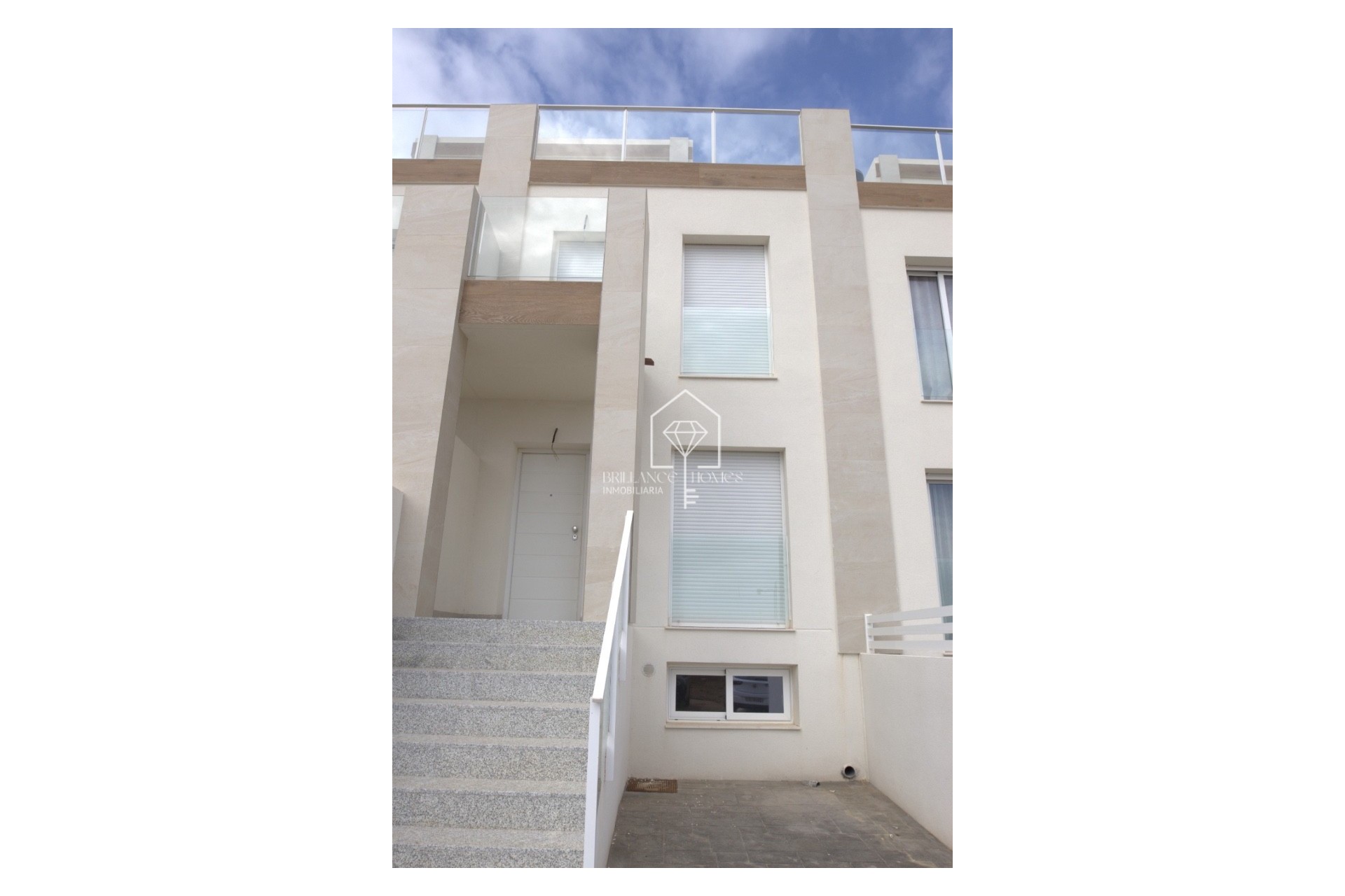 Dom jednorodzinny w stylu śródziemnomorskim. Jest zbudowany w blokach bliźniaczych bungalowów, z parkingiem na utwardzonej nawierzchni z betonu stemplowanego.